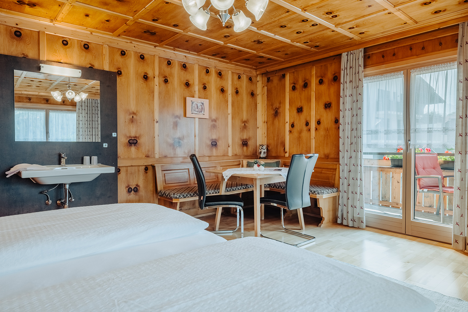 für 2 Personen mit Zugang zum Balkon, Doppelbett, Sitzgelegenheit und Waschbecken.