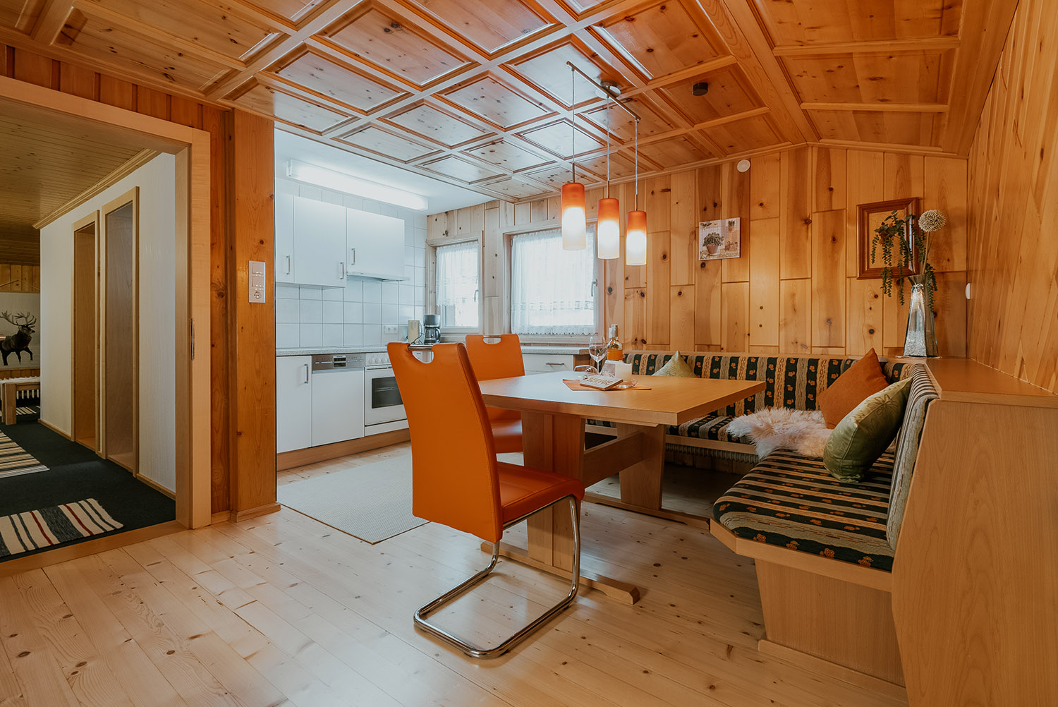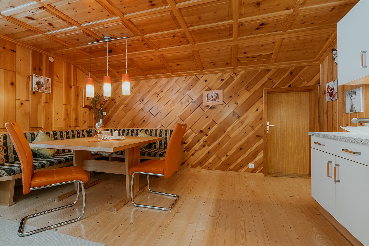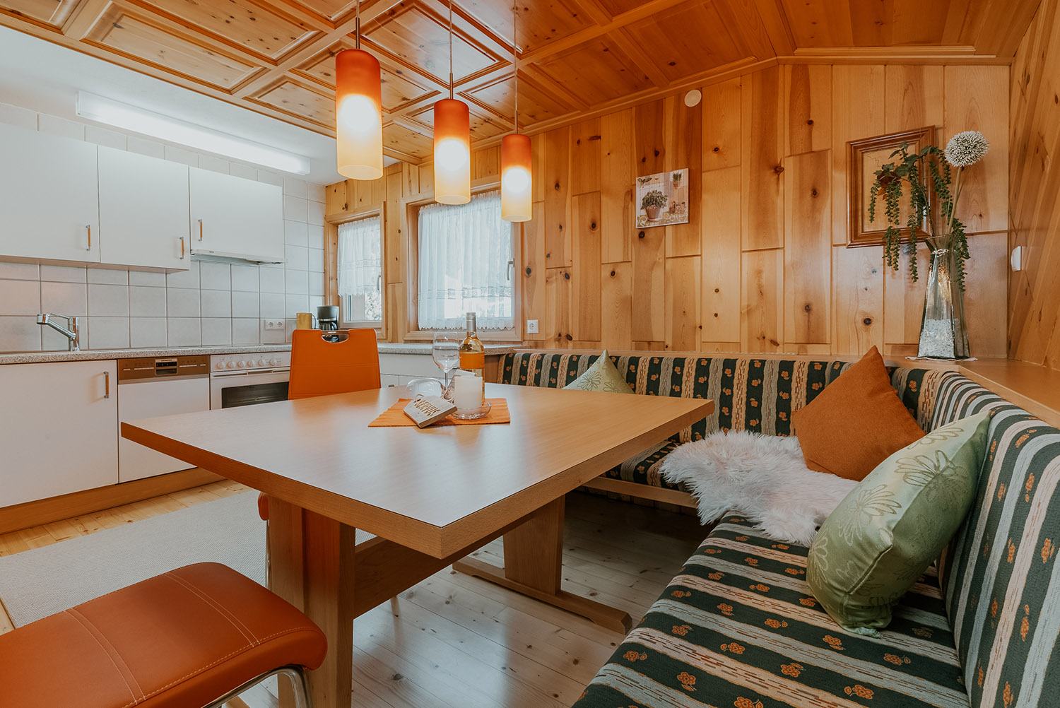 Rustikale Küche mit gemütlicher Eckbank ausgestattet mit Ceranfeld, Backrohr, Geschirrspülmaschine, Kühlschrank mit Gefrierfach, Kaffeemaschine (Filter), Wasser- und Eierkocher. Geschirrtücher vorhanden.