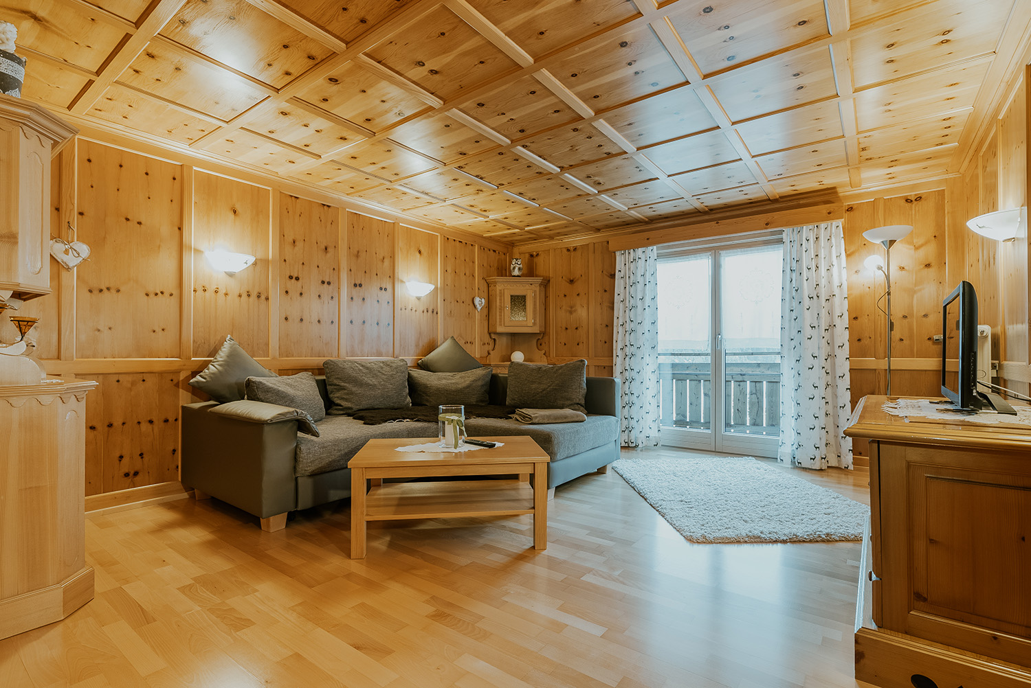 Separates Wohnzimmer mit Couch, Sat-TV und direktem Zugang zum Balkon nach Südwest.